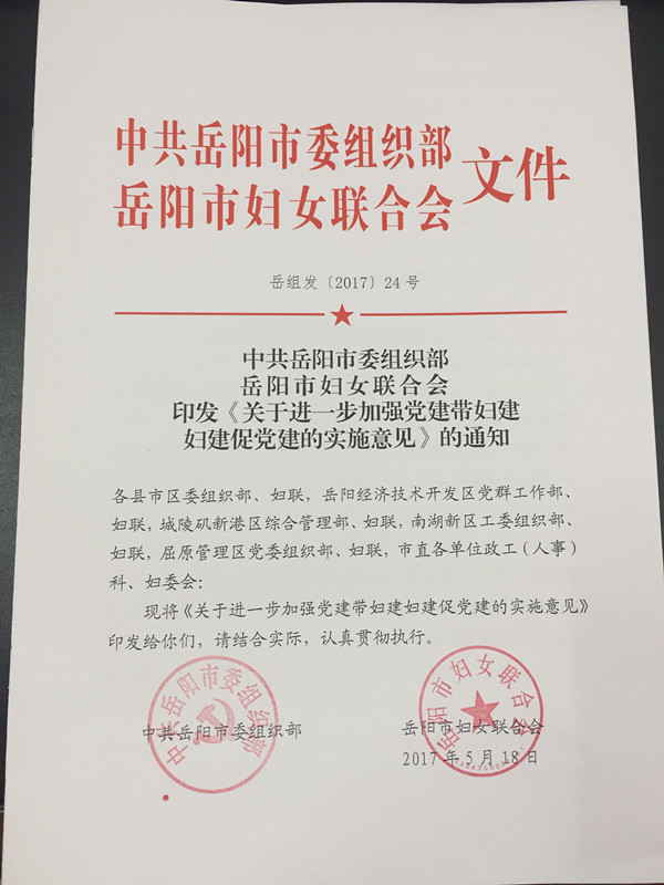 为进一步加强新形势下党建带妇建、妇建促党建工作,不断增强岳阳市基层党组织和妇联组织的生机和活力,更好地发挥妇联组织联系妇女群众的桥梁纽带作用,近日,岳阳市委组织部与妇联联合下发《关于进一步加强党建带妇建 妇建促党建的实施意见》(以下简称《意见》)。