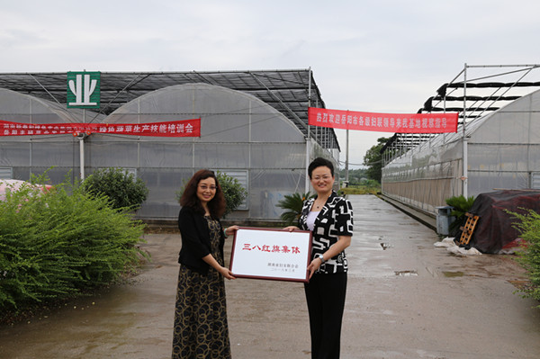 魏淑萍主席一行深入大棚基地、加工车间认真察看,与基地负责人亲切交谈,仔细询问生产和经营情况,在会议室听取了湖南新泰和岳阳绿色菜园网电子商务有限公司总经理罗玉纯的工作汇报,并代表省妇联为湖南新泰和岳阳绿色菜园网授予“湖南省三八红旗手集体”牌匾。魏淑萍主席对公司采用“互联网+农业”的发展模式给予点赞,对取得的成效给予了充分肯定,并希望全体女职工能珍惜荣誉,发扬巾帼不让须眉的精神,把绿色菜园网建设的更好。