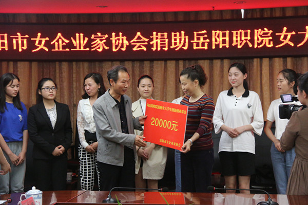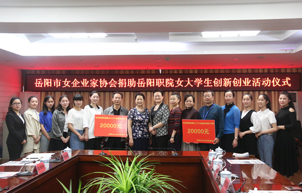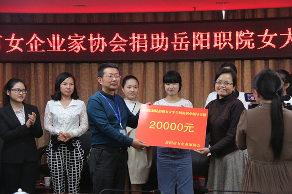 市女企业家协会副会长、岳阳市富凯制衣有限公司总经理沈富荣为职业技术学院创新创业孵化园的女大学生捐赠了20000元创新创业基金