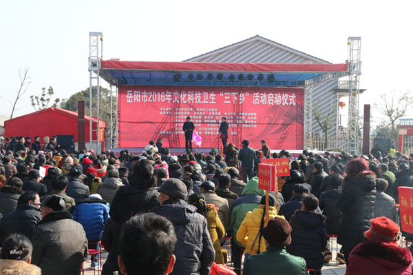 1月24日,在中共岳阳市委宣传部的统一组织下,岳阳市妇联、市文新广局、市卫生局、市文联等妇儿工委成员单位联合在湘阴县三塘镇开展了岳阳市2016年文化科技卫生“三下乡”活动启动仪式。来自市、县多个服务单位的工作人员通过文艺演出、赠送春联挂历、开展义诊、现场咨询、展牌宣传等方式,把党和政府的关怀送到农民朋友的心坎上。