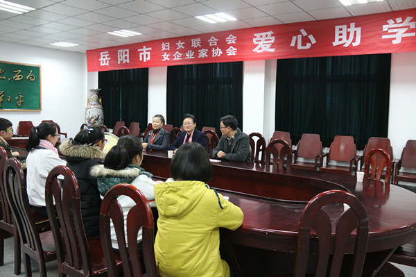 1月18日,岳阳市妇联、岳阳市女企业家协会在岳阳市第一中学开展本学期的第二次爱心助学活动。岳阳市妇联党组书记、主席魏淑萍,岳阳市一中副校长孙礼,女企业家协会代表沈富蓉出席活动,并参加座谈。活动上,每名贫困学生获得3000元爱心助学金。