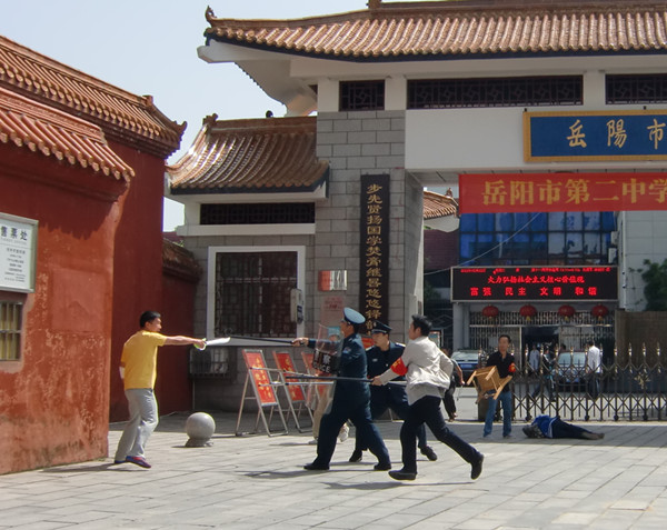 在二中演练现场。师生们正在走进校门。突然间一名暴徒持刀砍杀学生,一名学生当场砍翻在地。保安当即启动“一键式报警”系统,护校队员手持防暴器械迅速出动,与歹徒搏斗。同时,学生被疏散到教室躲避,关闭门窗,保持安静,全体教室在楼梯口、教室门口使用椅子等做防暴工具,护卫学生。校医也赶到开始包扎救治受伤学生、并通知120急救。不久,防暴警察全副武装赶到现场。在警察、保安、护校队强力制服歹徒。