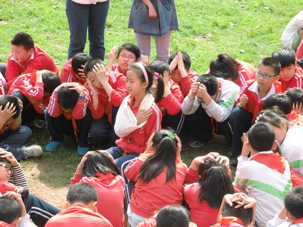 在民院附小现场,师生们在岳阳红十字蓝天救援队的指导下,护着头,弓着腰,小步快跑,从课堂撤到操场,场面紧张而有序。通过此次场景的演练,全体师生和家长掌握了地震时的逃生方式,以及伤口包扎处理技能。