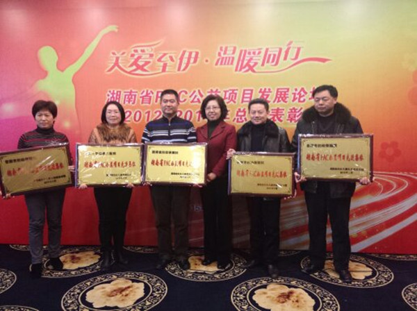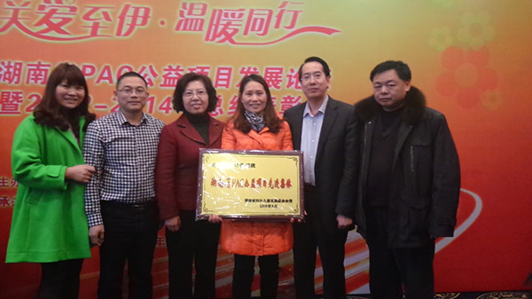 2月1日,湖南省PAC公益项目发展论坛暨2012-2014年总结表彰会在长沙举行。岳阳市妇幼保健院荣获湖南省PAC公益项目先进集体。图为中国妇女发展基金会主任胡金霞、中国妇女发展基金会项目执行主任张彦明、岳阳市妇联办公室主任黎伟与市妇幼保健院领导及项目负责人合影。