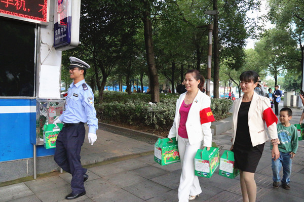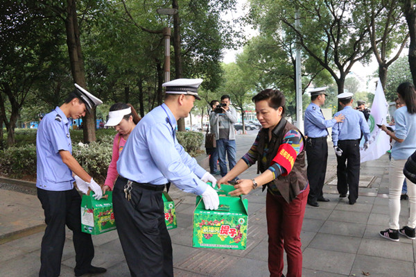 吴玉玺与巾帼志愿者们与执勤交警亲切交流,对他们辛勤的工作表示感谢,并送上水果等慰问品。