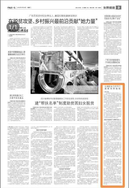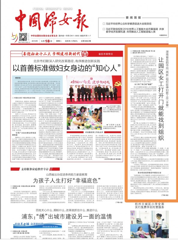 9月18日《中国妇女报》在头版醒目位置,以《让园区女工打开大门就能找到组织》为题,从女工有了自己的“娘家”、助女性在经济建设中建功立业、把妇女姐妹的“小事情”放心上等三个方面,2000多字全面报道了岳阳市妇联依托“党建带妇建、妇建促党建”、创新思路,稳步推进在工业园区等“两新”组织中建妇联的情况。