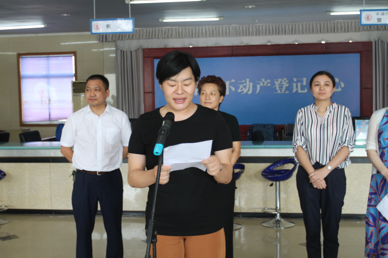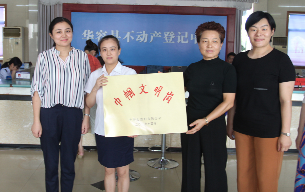 8月22日,华容县不动产登记中心全国“巾帼文明岗”授牌仪式在县政务服务中心隆重举行。市妇联副主席吴玉玺为县不动产登记中心授牌,市妇联事业发展部副部长喻谦宣读全国妇联表彰决定,县人民政府副县长赵群子、县妇联主席徐敏、县国土资源局副局长彭子能及不动产登记中心全体干部职工参加授牌仪式。