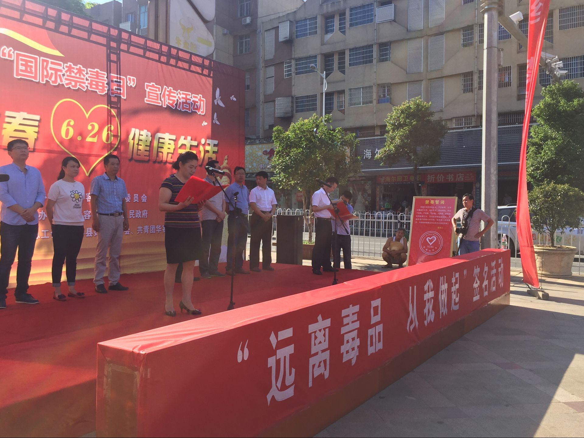 县妇联主席廖爱华同志宣读了《禁毒倡议书》,并组织禁毒妈妈志愿者和蓝结行动志愿者进行了宣誓。县人民政府副县长、县公安局局长余昕在活动上致词,要求各级各部门把禁毒工作作为一种常态,号召广大干部群众加入到禁毒队伍中来,加大打击吸毒、贩毒的违法案件。活动最后,领导带头参与了“远离毒品,从我做起”的万人签名活动,活动当天,600多名干部群众也积极参与了签名活动。