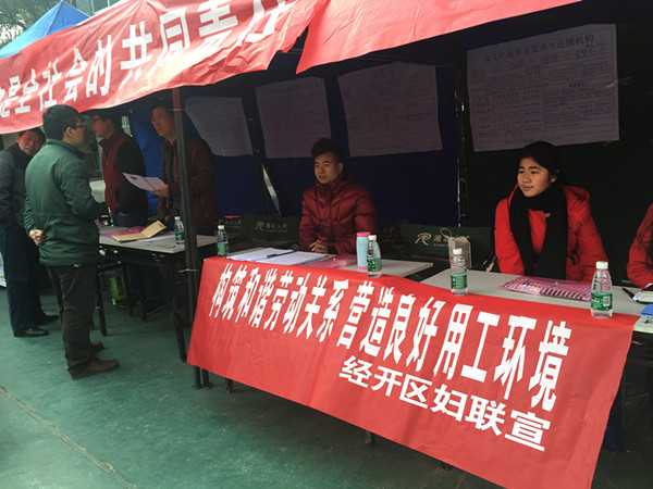 为帮助解决我区城乡待业、失业妇女就业、再就业难等问题,2月20日上午,区妇联通过市妇联及市劳动和社会保障局举办人才招聘这一平台,组织辖区五家企业参加现场招聘,并为现场求职妇女提供政策咨询解答、法律援助、权益维护等服务。活动期间,发放《妇女权益保障法》、《维权服务手册》、《农民工进城就业指南》、《农村劳动者进城就业服务春风卡》等宣传资料2000余份,接待咨询150余人次。据初步统计,招聘会现场共签订女性意向用工协议40余份。