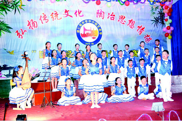 图为云溪区道仁矶镇中学的孩子们诵读国学经典