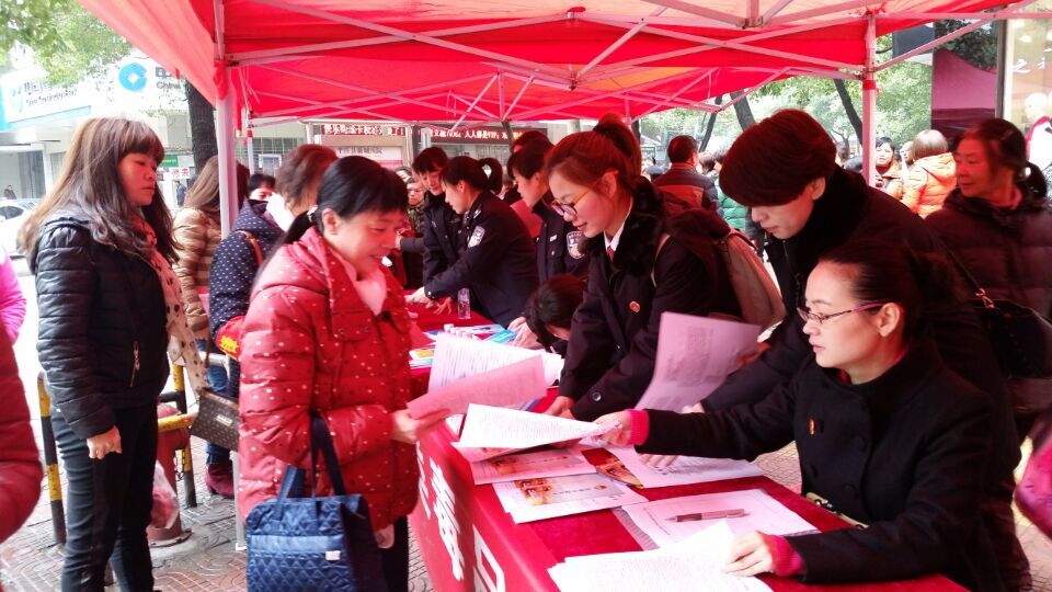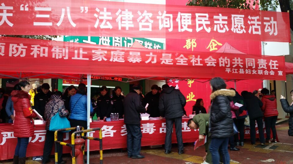 3月6日上午,平江县妇联联合政法系统在县城十字街举行了庆三八法律咨询便民志愿活动,向过往的群众发放了男女平等基本国策、预防和制止家庭暴力、《婚姻法司法解释三》、禁毒宣传、法律知识手册及平安宝典书等宣传资料3000余份,并在现场提供了婚姻、未成年人犯罪等方面的法律咨询。