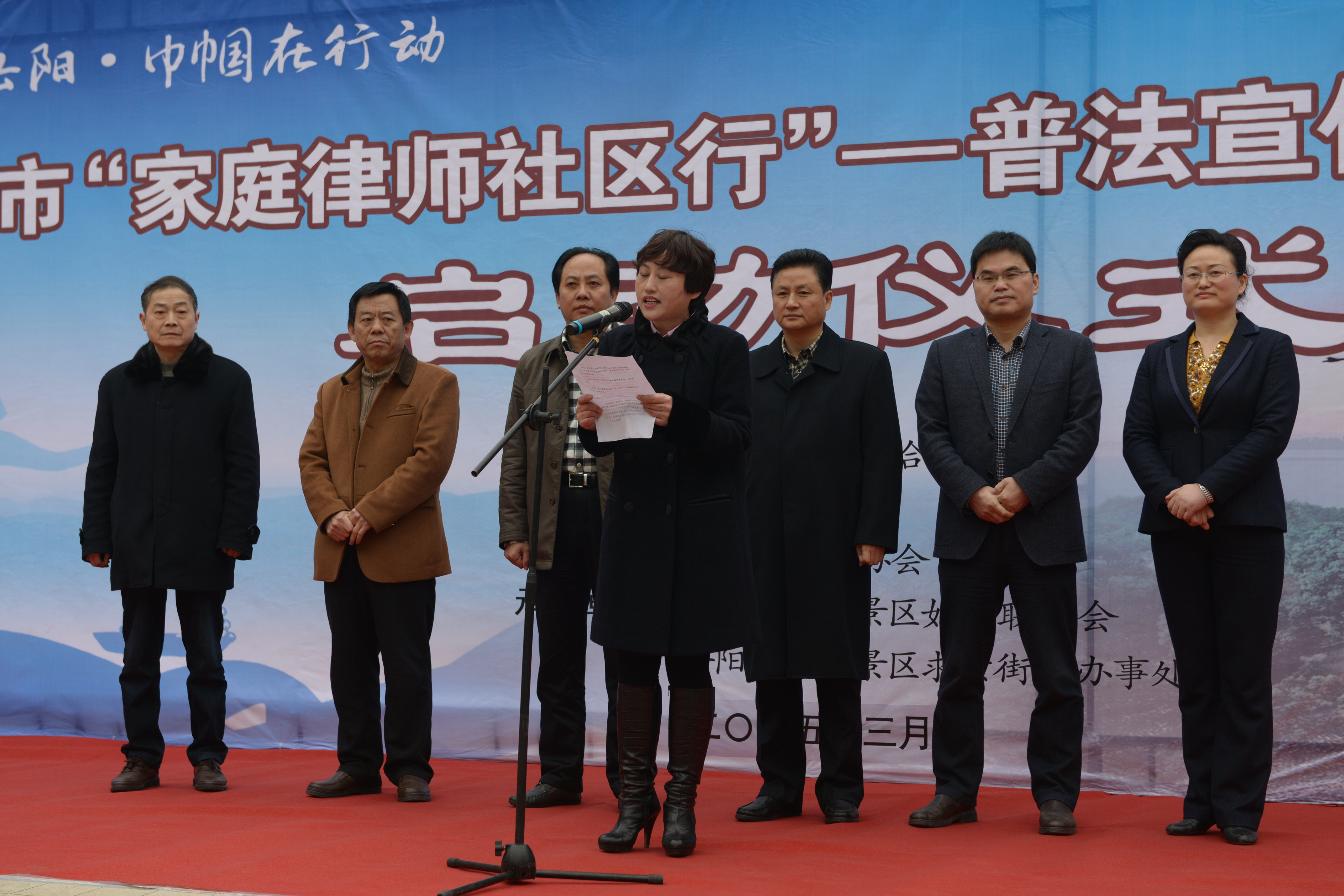 活动现场,区工委书记李美云做了热情洋溢的致辞,律师代表和市妇联主席魏淑萍分别做了发言和讲话,岳阳市委常委、政法委书记向伟雄、市人大副主任余炳锐等市级领导亲临现场,并授旗和宣布活动正式开始。活动中,市领导参观了现场的巾帼志愿者义诊和法律现场咨询以及在室内开展的婚姻财产、家庭暴力、妇女劳动权益等法律常识讲座,市领导对此次活动开展非常肯定,希望通过本次活动的开展,引导干部群众办事依法、遇事找法、解决问题用法、化解矛盾靠法,努力营造守法光荣、违法可耻的良好社会氛围。(南湖风景区妇联)