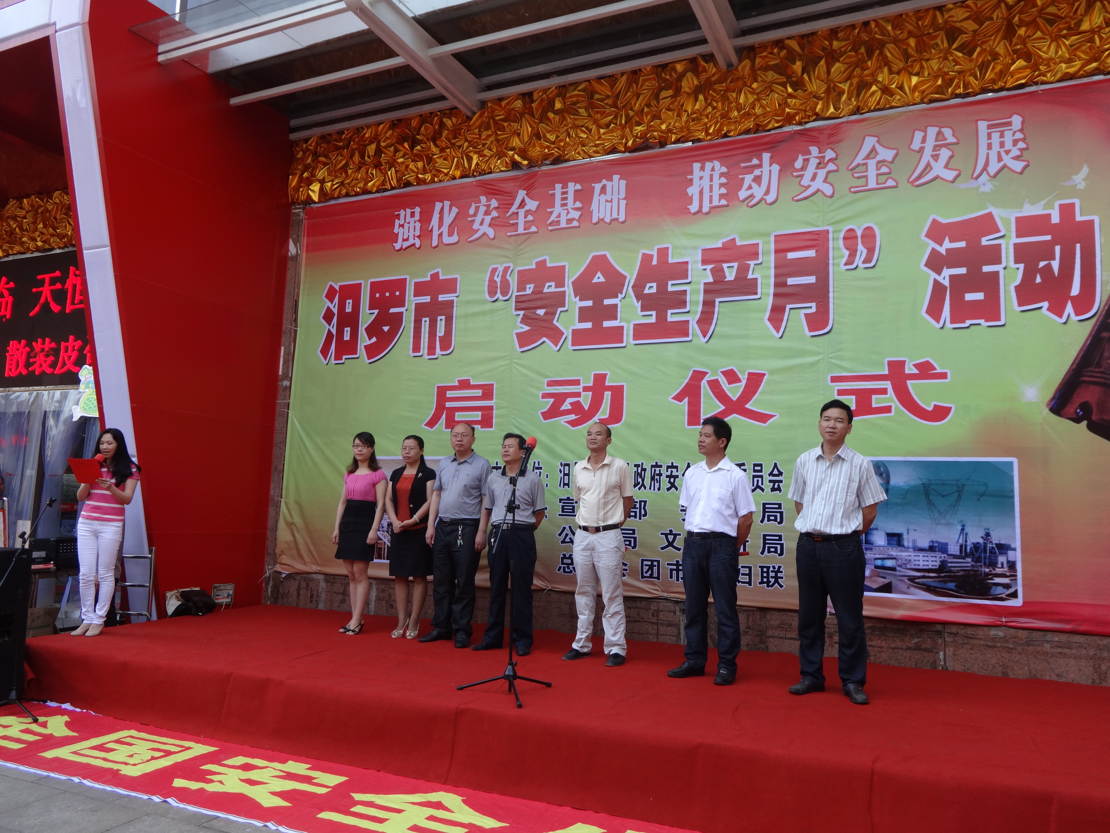 6月5日,在城区天恒量贩超市前坪,由汨罗市人民政府安全生产委员会牵头,市委宣传部、市安监局、市公安局、市文广新局、市总工会、团市委、市妇联8个部门联合举办、35个相关部门和企业参加的第十二个安全生产月活动启动仪式正式举行。现场开展了安全生产知识咨询活动,并通过媒体、宣传车广泛传播,这标志着我市以“强化安全基础,推动安全发展”为主题的安全生产月活动正式拉开帷幕。 据悉6月1日至30日,我市将分别进行安全生产事故警示教育周、安全文化宣传周、安全生产应急预案演练周、安全生产知识普及周。突击消除各类安全事故隐患,推动各级全面落实安全生产工作责任,坚决遏制重特大安全事故的发生,全面实现我市的安全生产工作目标,促进全市安全生产形势持续稳定好转。市妇联主席周琴接受记者采访时说道:“妇联将切实做好安全生产活动的宣传员,紧紧围绕安全生产月的主题,组织开展“巾帼安全文明示范岗”、“文明家庭”,“平安校园”创建等活动;将进一步做好安全生产工作的监督员、推动者,认真组织开展系列宣传教育活动,努力促进安全生产工作再上新台阶,为建设平安、幸福、文明的汨罗作出更大的贡献。”