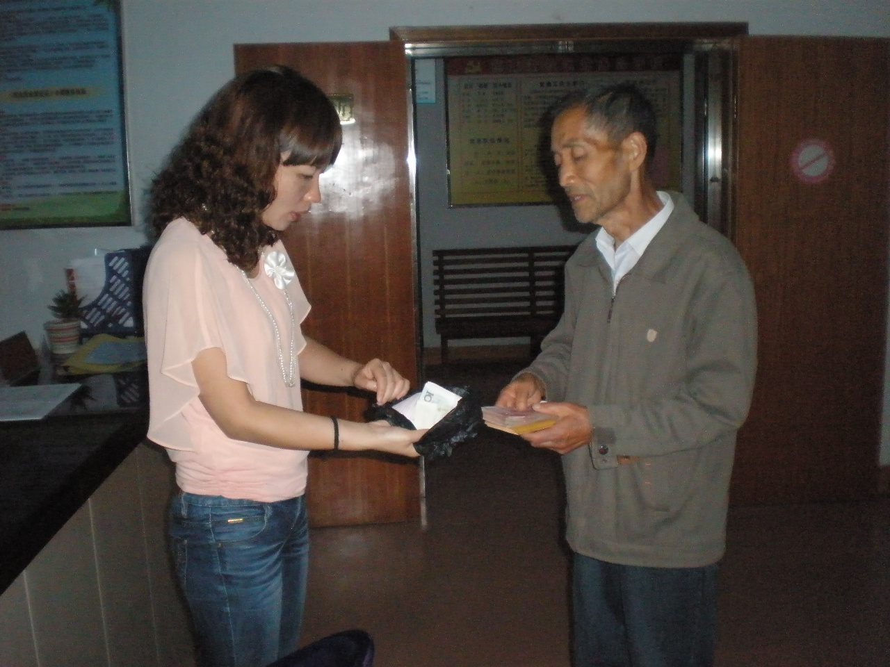2013年5月29日傍晚,吃过晚饭的芭蕉湖社区洪源小区居民刘新财和老公李继明一起在社区大门口的草坪打羽毛球,李继明在捡球时无意中发现草丛里有个黑色塑料袋,还露出存折的一角,捡来打开一看,里面除了有两张存折外还有一摞现金,夫妻二人没敢细数,想着失主肯定万分着急,马上联系社区主任并将财物交由社区保管。随后,社区安排专人负责,组织楼栋长挨家挨户寻找失主,于晚上十点左右联系上了失主,并电话告诉他不要着急,约定好见面的时间、地点。第二天一早,社区主任将两张存折和5000多元现金交到失主李武元老人手中,老人颤抖的手紧握着刘新财,万分感激的说:“这是我和老伴的退休工资,老伴看病全靠它了,小刘姑娘,你真是个好人!