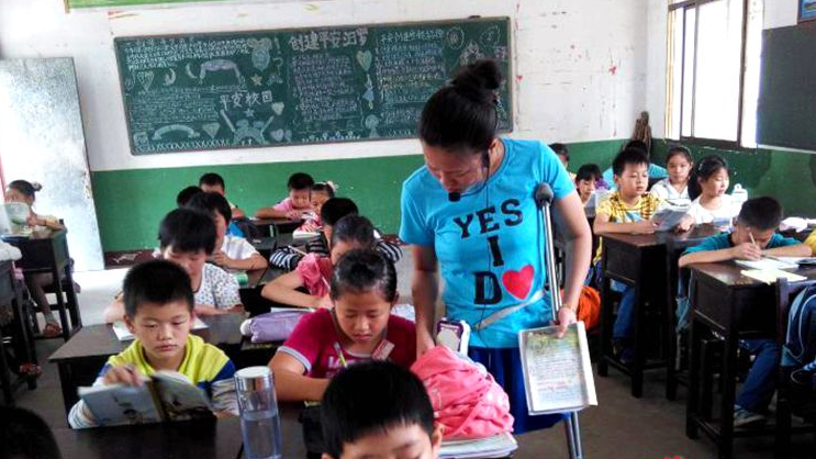 新学期的第一天,李家塅中学小学部五年级教室里传出琅琅的读书声,讲台上,是一位拄着拐杖的老师。她叫张婵,今年23岁。